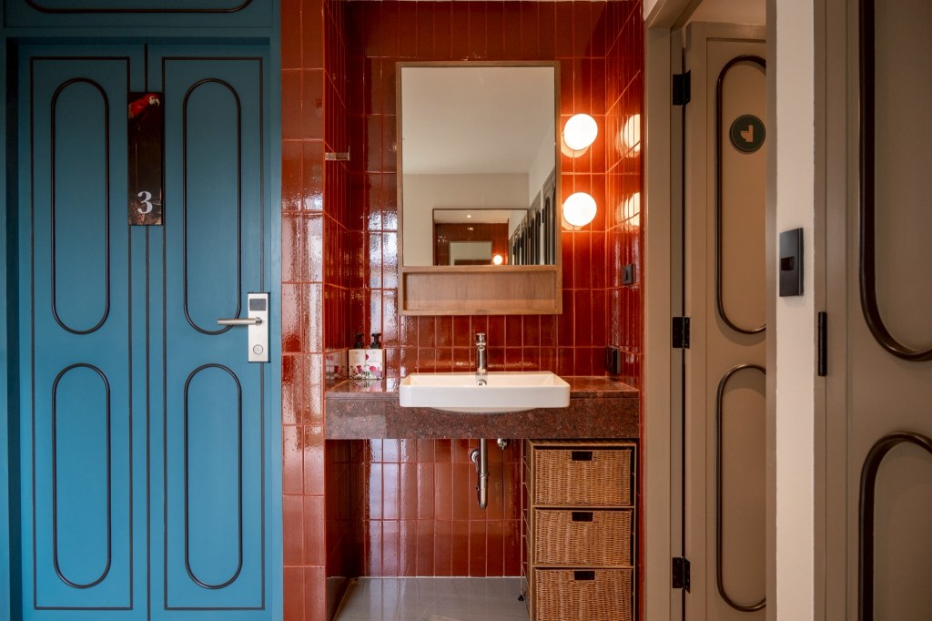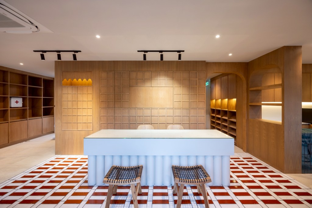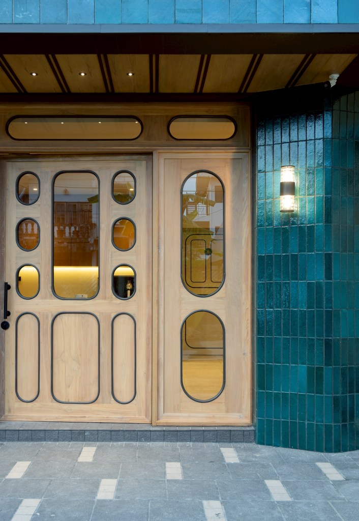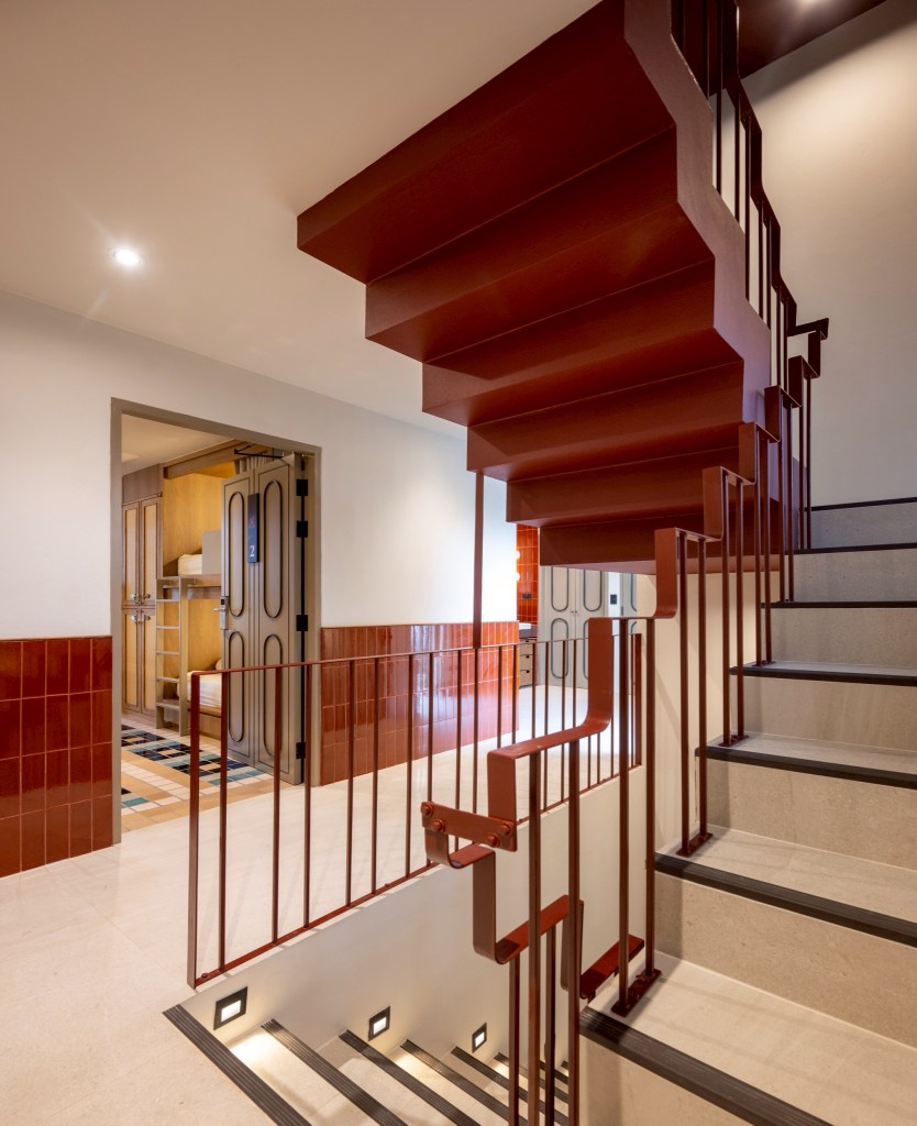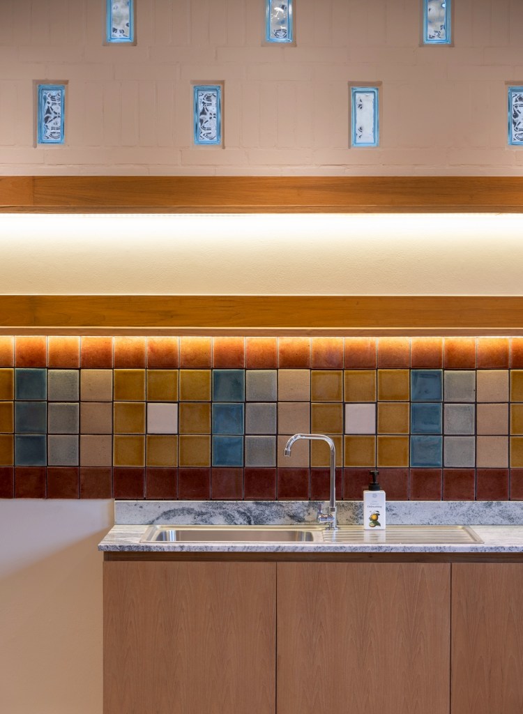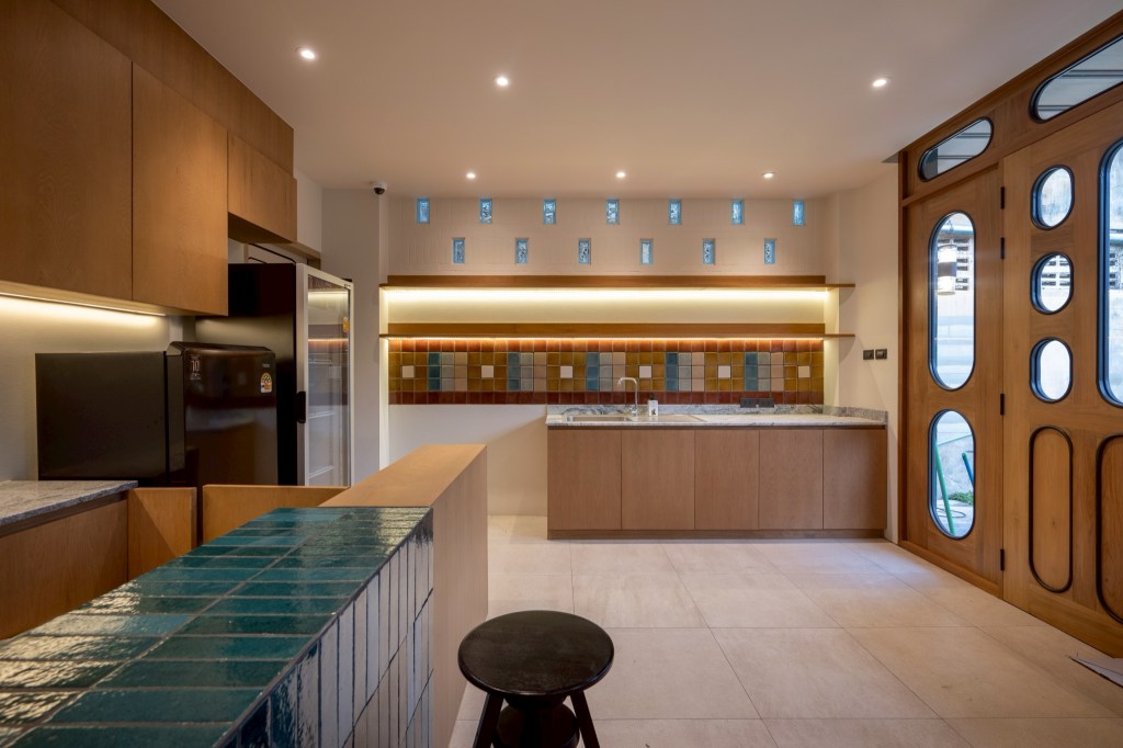 Inside, the atmosphere is defined by light-toned surfaces and natural wood, creating a warm and quiet environment. This is contrasted with colorful ceramic tiles—such as Umthumphon red, tin grey, burnt brown, and peacock blue—arranged into distinct patterns that vary across spaces. Selective use of color accents, including the maroon staircase and peacock blue doors, introduces moments of identity, orientation, and memory within the interior