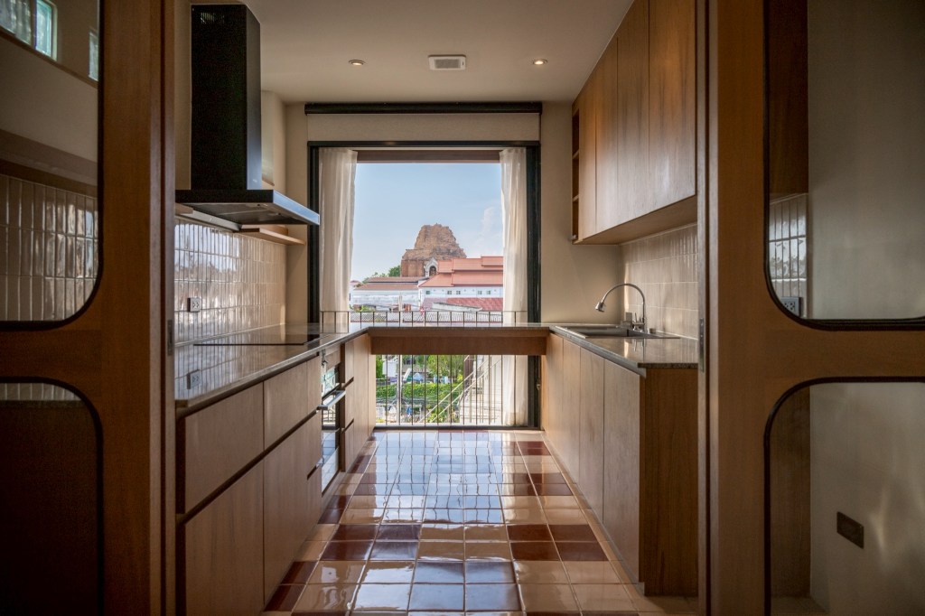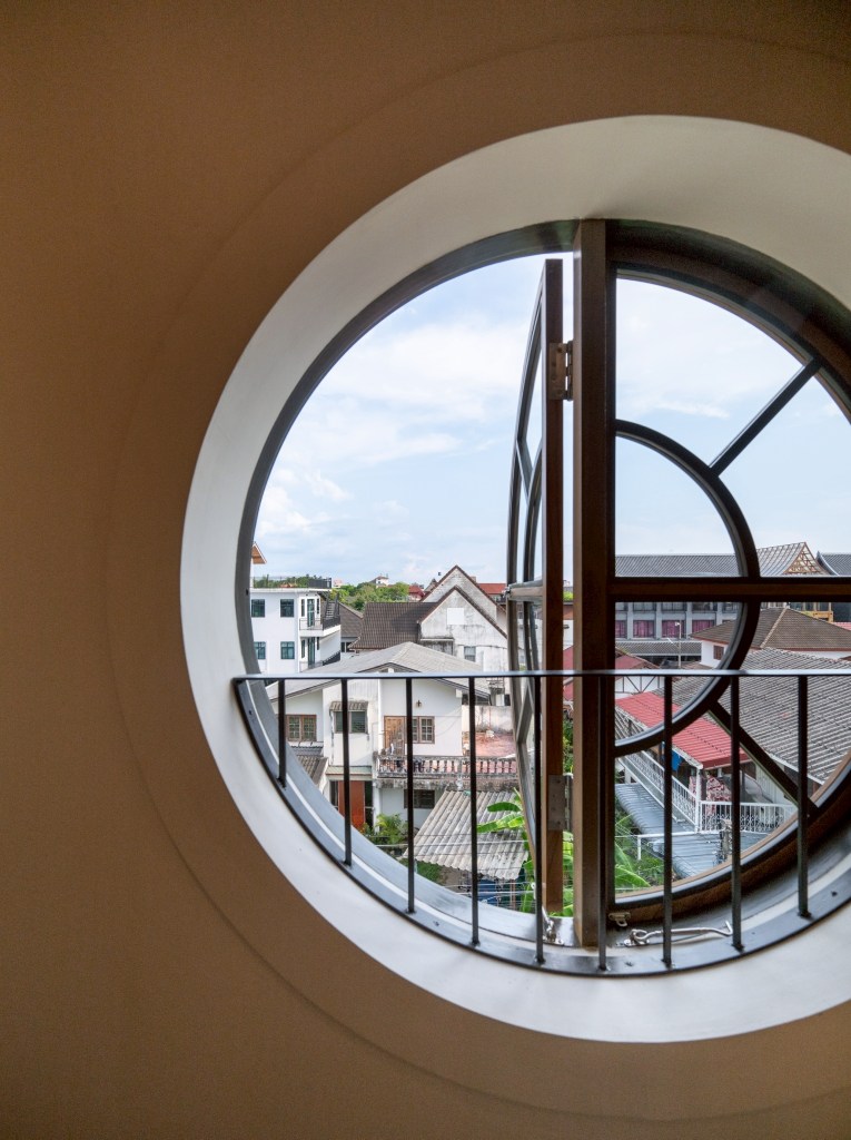 The fourth floor serves as the owner’s private residence. Designed in a restrained palette of white and beige, combined with natural wood built-ins, the space includes a bedroom, walk-in closet, bathroom, living area, and kitchen. Views extend toward Wat Chedi Luang, one of Chiang Mai’s most significant landmarks, while three circular windows introduce a distinctive architectural character.