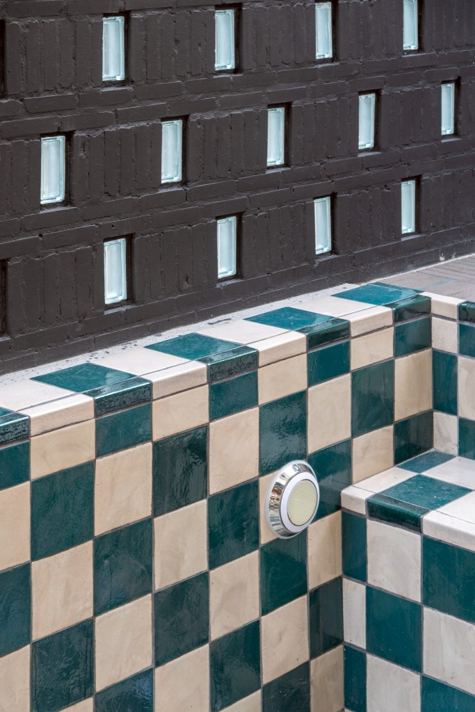 The building’s material palette is rooted in locally sourced elements—terracotta tiles, brick, and glass blocks—assembled into layered patterns across different surfaces.