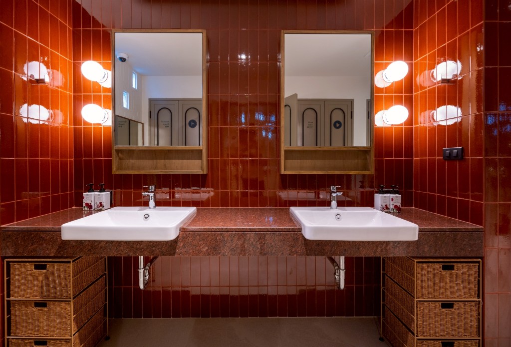 Guest rooms are located on the second and third floors. A central circulation core is positioned at the rear, with bathrooms placed on both sides. This arrangement frees the front façade for the dormitory spaces, ensuring access to natural light and outward views.